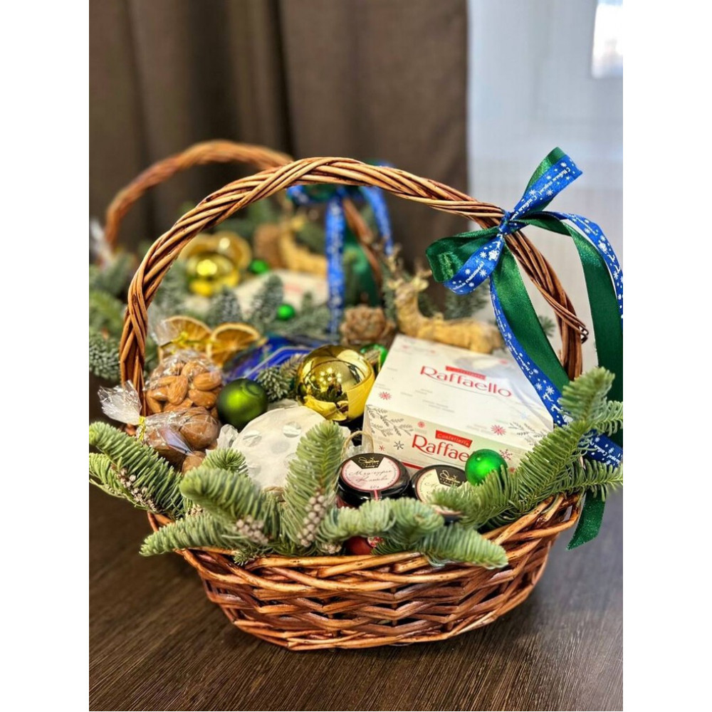 Конфеты Ferrero Collection 175 г, Ель, Новогодний декор, Корзина, Печенье в жестяной коробке 400 г, Кофе Jacobs растворимый 100 гр, Джем (2 шт.), Конфеты Domior 225 гр